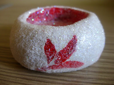 Basit bir mumluk yaptım hemencecik..Kuruyunca ,beyaza boyadım,kırmızı su bazlı boya ile stencil kullanarak yaprak motifi yaptım.İç kısmını da kırmızıya boyadım.